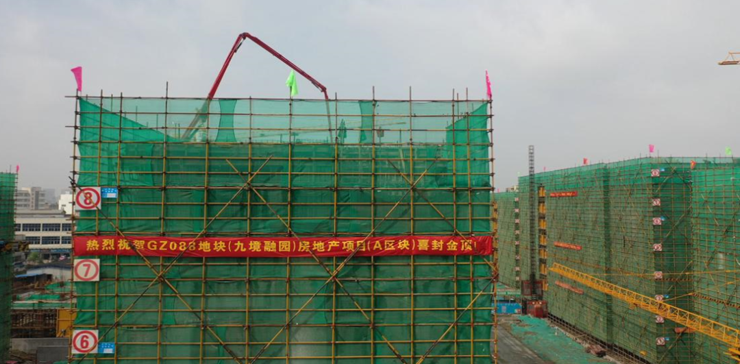 9月18日一早,九境融園項(xiàng)目施工現(xiàn)場(chǎng)萬(wàn)里晴空、惠風(fēng)和暢,寫著“熱烈祝賀GZ088地塊(九境融園)房地產(chǎn)項(xiàng)目(A區(qū)塊)喜封金頂”字樣的橫幅格外閃耀。伴隨著3、5號(hào)樓屋面頂板混凝土澆筑,在建設(shè)單位、監(jiān)理單位及施工單位的共同見證下,九境融園項(xiàng)目A區(qū)塊工程正式完成全部主體結(jié)構(gòu)的封頂。
