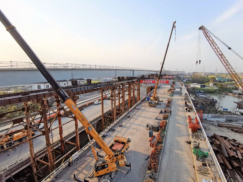 運(yùn)河南北路快速化改造二期工程(萬(wàn)福西路—物港路北)全線采用高架式快速路斷面,總長(zhǎng)2.73公里,標(biāo)段范圍內(nèi)包含運(yùn)河南北路高架、萬(wàn)福路互通樞紐和全線地面道路。高架主線橋上部結(jié)構(gòu)大部分采用現(xiàn)澆預(yù)應(yīng)力混凝土連續(xù)箱梁,在運(yùn)河北路與古運(yùn)河交界處,設(shè)計(jì)在原夫差橋上方進(jìn)行施工架設(shè),平行上跨新建230米左右幅三跨連續(xù)鋼箱梁,雙向10車(chē)道,是揚(yáng)州快速環(huán)路中唯一一座平行上跨新建的“橋上橋”。其中,鋼箱梁施工采用的是搭設(shè)高空施工平臺(tái),將鋼箱梁吊運(yùn)至平臺(tái)上拼裝,然后頂推到位的方法施工。
