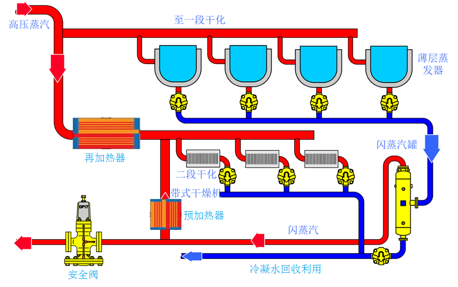 來(lái)自薄層蒸發(fā)器的疏水閥排出的高溫、高壓冷凝水全部進(jìn)入閃蒸罐進(jìn)行閃蒸分離,產(chǎn)生的閃蒸蒸汽進(jìn)入預(yù)加熱器,預(yù)加熱器對(duì)帶式干燥機(jī)內(nèi)循環(huán)空氣進(jìn)行加熱,當(dāng)溫度不能滿(mǎn)足生產(chǎn)要求時(shí),開(kāi)啟再加熱器對(duì)循環(huán)空氣進(jìn)行再次加熱。閃蒸罐分離后的冷凝水通過(guò)底部疏水閥與預(yù)加熱器排出的冷凝水匯合后排入現(xiàn)有蒸汽冷凝水箱。閃蒸罐上設(shè)置安全閥,當(dāng)系統(tǒng)異常,安全閥打開(kāi)泄壓。