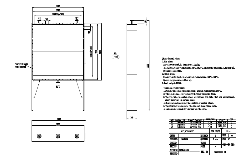 對(duì)每條線(xiàn)的現(xiàn)有預(yù)加熱器進(jìn)行改造,根據(jù)現(xiàn)有尺寸、接口改造為蒸汽、空氣換熱的管殼換熱器,預(yù)加熱器改造圖如圖4: