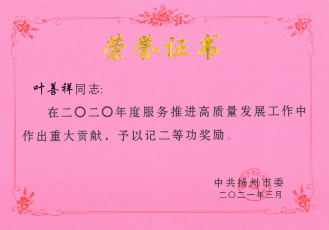 3月31日,在全市高質(zhì)量發(fā)展總結(jié)表彰大會上,城控集團被表彰為2020年度市級機關(guān)績效考評“一等等次單位”,這是集團轉(zhuǎn)型發(fā)展以來連續(xù)四次、歷史第七次獲得該項殊榮。集團黨委書記、董事長葉善祥榮立二等功。
