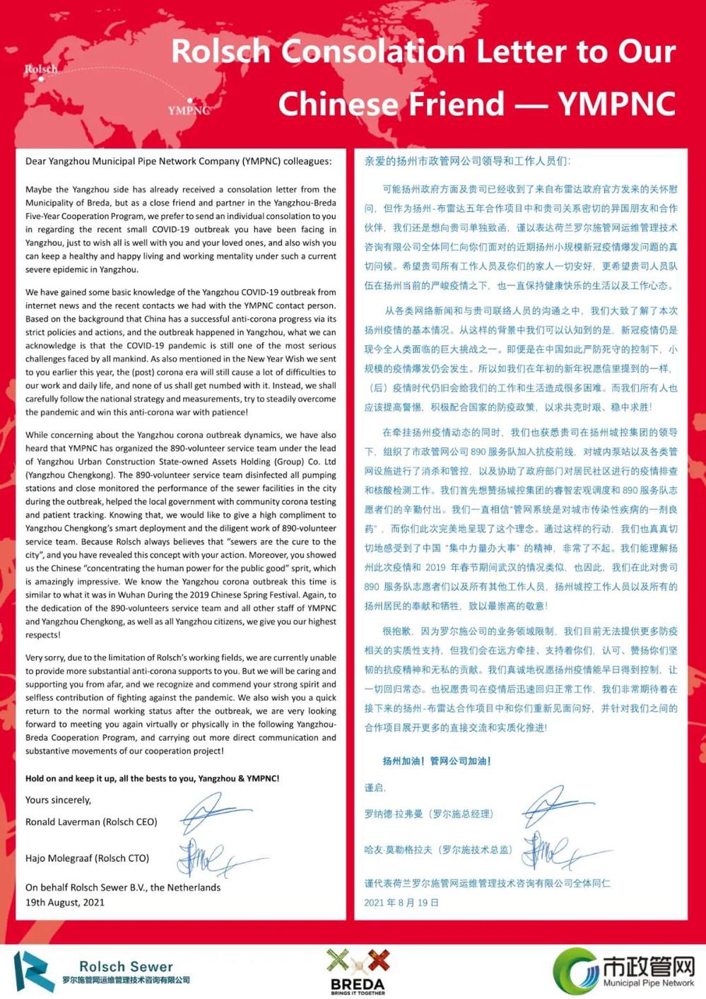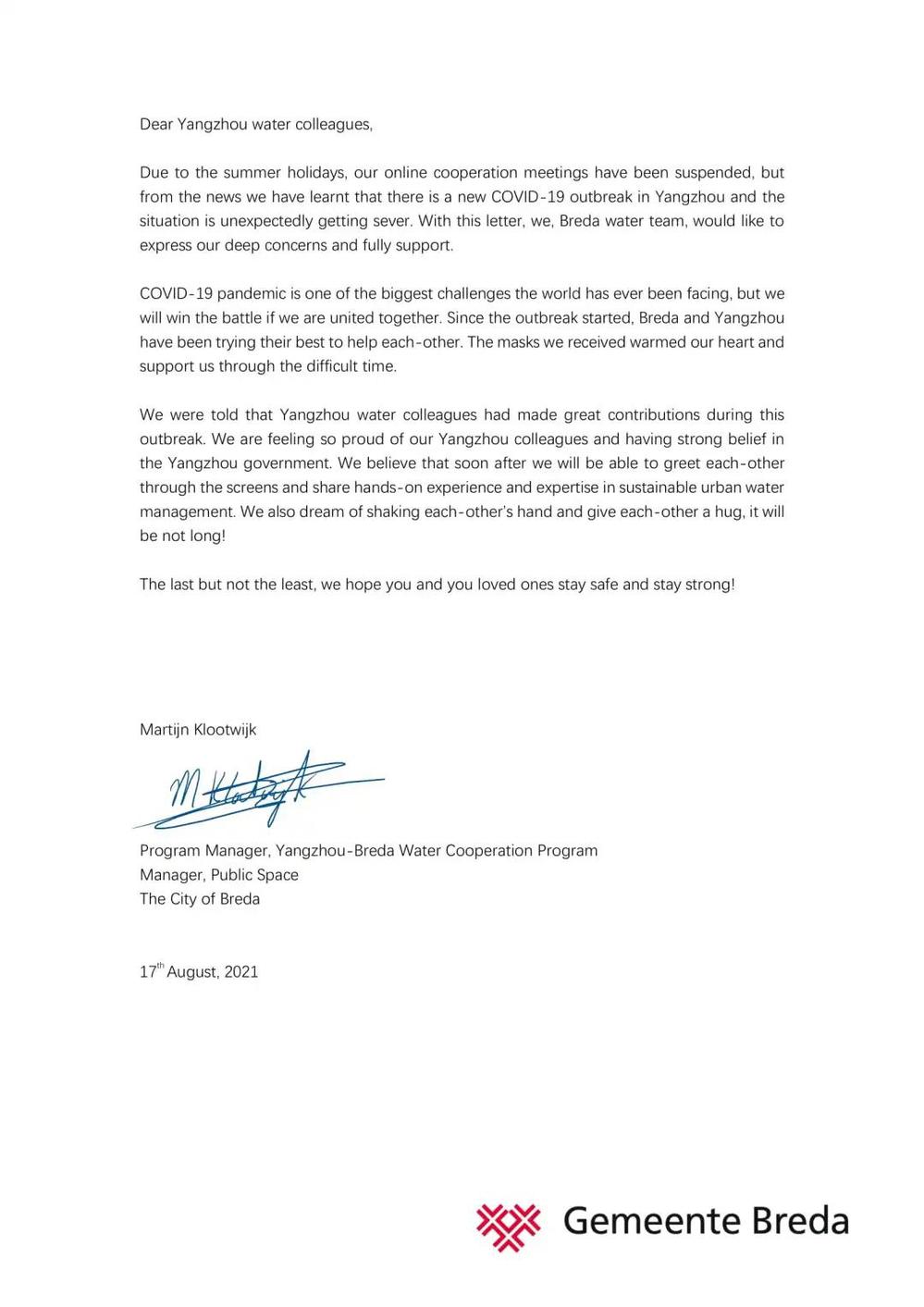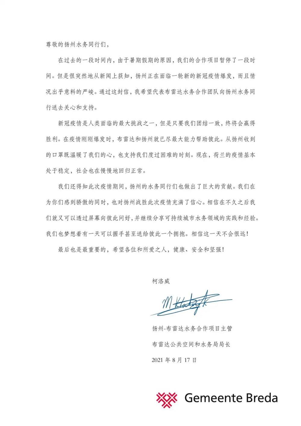 8月18日,在我市新冠肺炎疫情防控的攻堅(jiān)時(shí)刻,城控集團(tuán)收到荷蘭布雷達(dá)市公共空間和水務(wù)局以及羅爾施管網(wǎng)運(yùn)維管理技術(shù)咨詢(xún)有限公司發(fā)來(lái)的暖心慰問(wèn)函。信函中,布雷達(dá)市公共空間和水務(wù)局局長(zhǎng)馬丁·科洛威先生以及羅爾施管網(wǎng)運(yùn)維管理技術(shù)咨詢(xún)有限公司總經(jīng)理羅納德·拉弗曼先生對(duì)我市正在蔓延的新冠肺炎疫情表示關(guān)切;向身處疫情中的廣大城控集團(tuán)員工及家人表示誠(chéng)摯的問(wèn)候,對(duì)“890管網(wǎng)服務(wù)隊(duì)”代表的“城控”抗疫志愿者奮戰(zhàn)“疫”線(xiàn)的擔(dān)當(dāng)精神,致以崇高的敬意。這封遠(yuǎn)隔重洋飛馳而來(lái)的慰問(wèn)信,彰顯了兩座城市間彌足珍貴的友誼,也增強(qiáng)了“城控人”打贏這場(chǎng)疫情防控阻擊戰(zhàn)的信心。