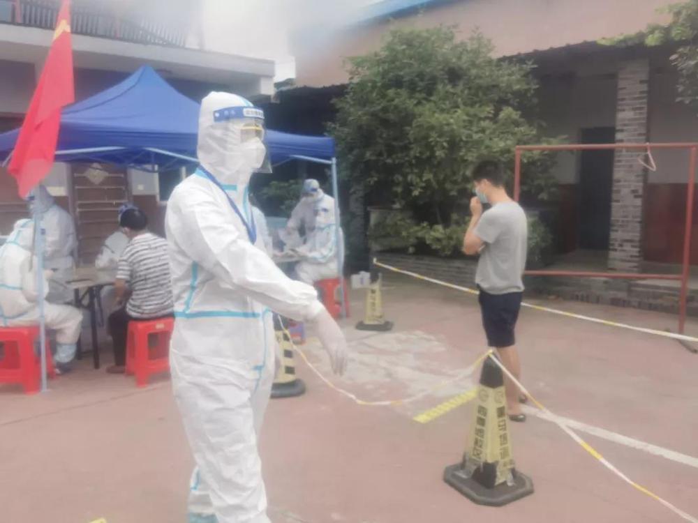 8月7日,一夜之間,揚州增加了確診患者52例,其中有20例都是發(fā)生在武塘社區(qū),武塘社區(qū)居民談“疫”色變。當(dāng)天上午,志愿服務(wù)隊負責(zé)在武塘社區(qū)四季園菜場核酸檢測點維持居民核酸檢測秩序。從早上8點開始,檢測點兩側(cè)就排起了長長的隊伍,“兩個人負責(zé)喊居民準(zhǔn)備好身份證和健康碼,其他人都去維持秩序,保持兩米距離,不能讓群眾過于聚集,動作迅速!”隊員們一邊做好檢測物資的運送,一邊迅速開展了對核酸檢測隊伍秩序維護工作。