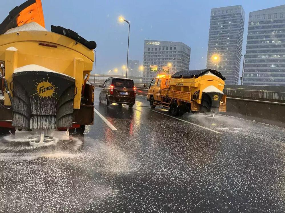 結(jié)合快速路網(wǎng)綜合應(yīng)急指揮部相關(guān)要求,應(yīng)急小組對(duì)橋梁、隧道劃分片區(qū)進(jìn)行管理。第一時(shí)間在各片區(qū)配置現(xiàn)場(chǎng)應(yīng)急人員以及相應(yīng)車輛、設(shè)備、防雪防滑物資。全天不間斷使用掃雪車、融雪撒布車等專業(yè)設(shè)備對(duì)快速路高架、隧道等處進(jìn)行撒鹽、除雪處理,切實(shí)保障快速路全線無(wú)結(jié)冰現(xiàn)象。
