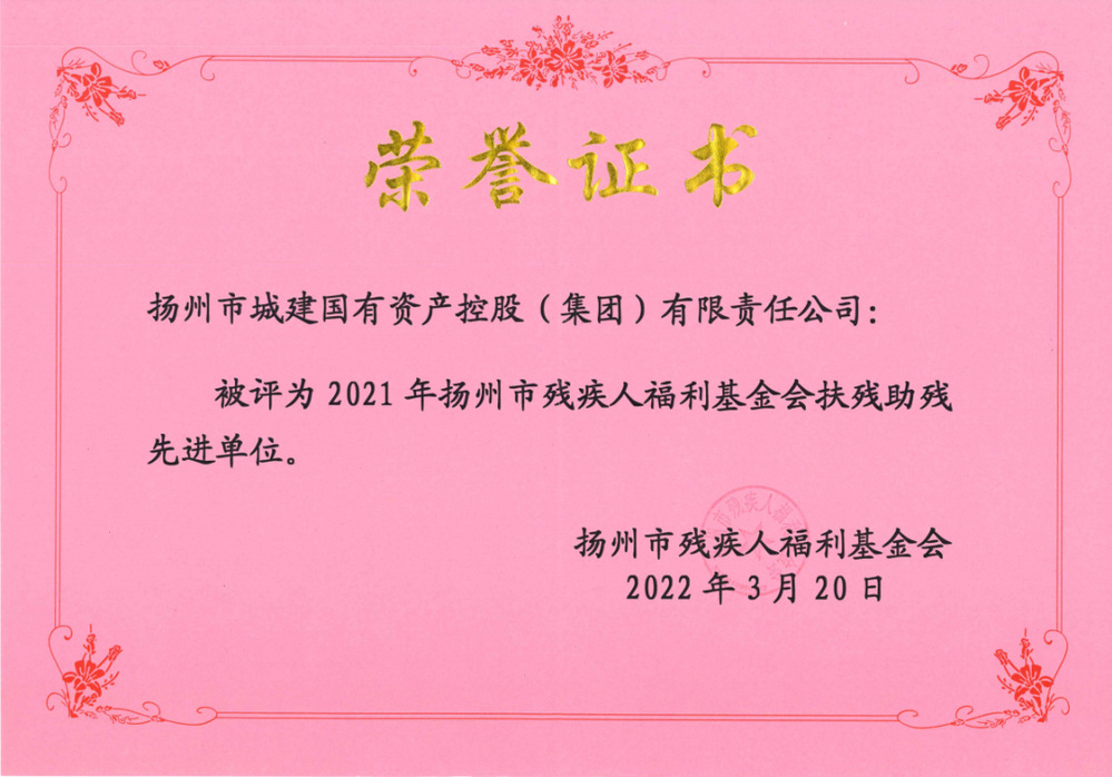 日前,城控集團被揚州市殘疾人福利基金會表彰為“2021年扶殘助殘先進單位”稱號。這是城控集團在履行社會責(zé)任、關(guān)愛弱勢群體工作中獲得的又一項榮譽。