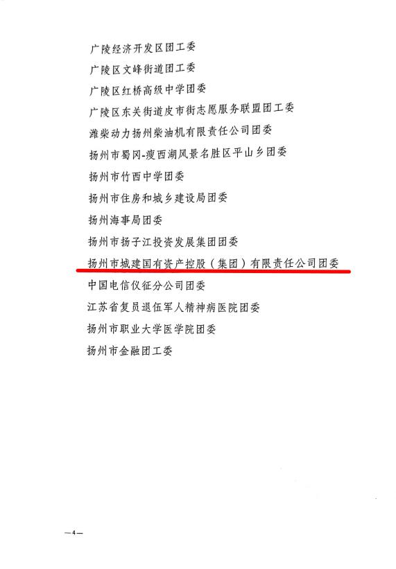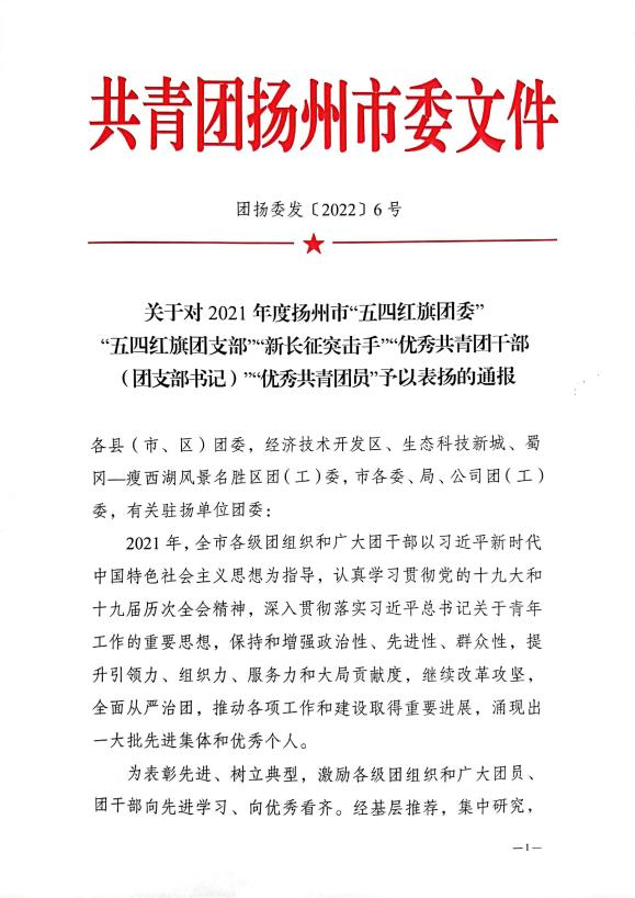 2022年是中國共青團成立100周年。近日,揚州團市委印發(fā)了《關于對2021年度揚州市“五四紅旗團委”“五四紅旗團支部”“新長征突擊手”“優(yōu)秀共青團干部(團支部書記)”“優(yōu)秀共青團員”予以表揚的通報》(揚團委發(fā)〔2022〕6號),城控集團團委被授予2021年度揚州市“五四紅旗團委”稱號。