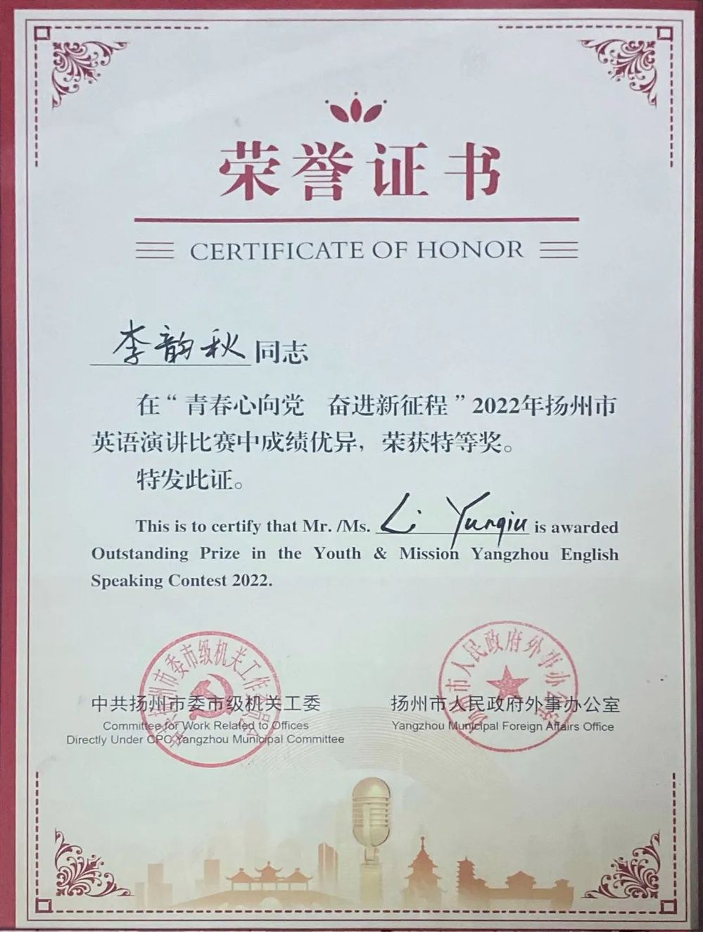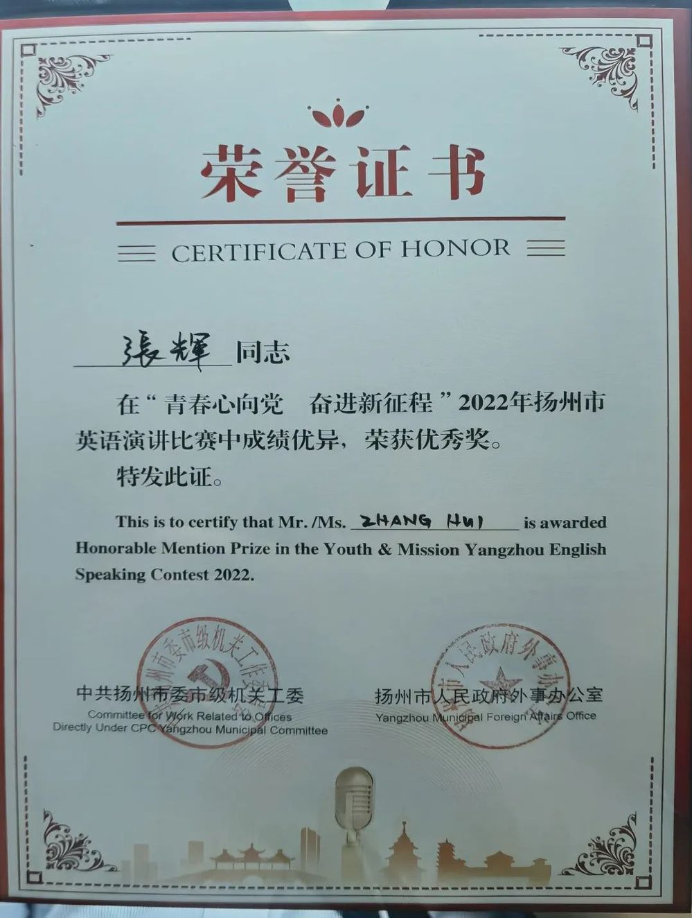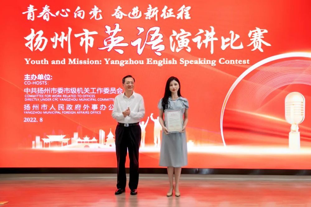 8月20日上午,在揚州市委市級機(jī)關(guān)工委與揚州市人民政府外事辦公室聯(lián)合舉辦的“青春心向黨,奮進(jìn)新征程”2022年揚州市英語演講比賽決賽中,城控集團(tuán)本部李韻秋同志和建盛公司張輝同志分別榮獲特等獎和優(yōu)秀獎。