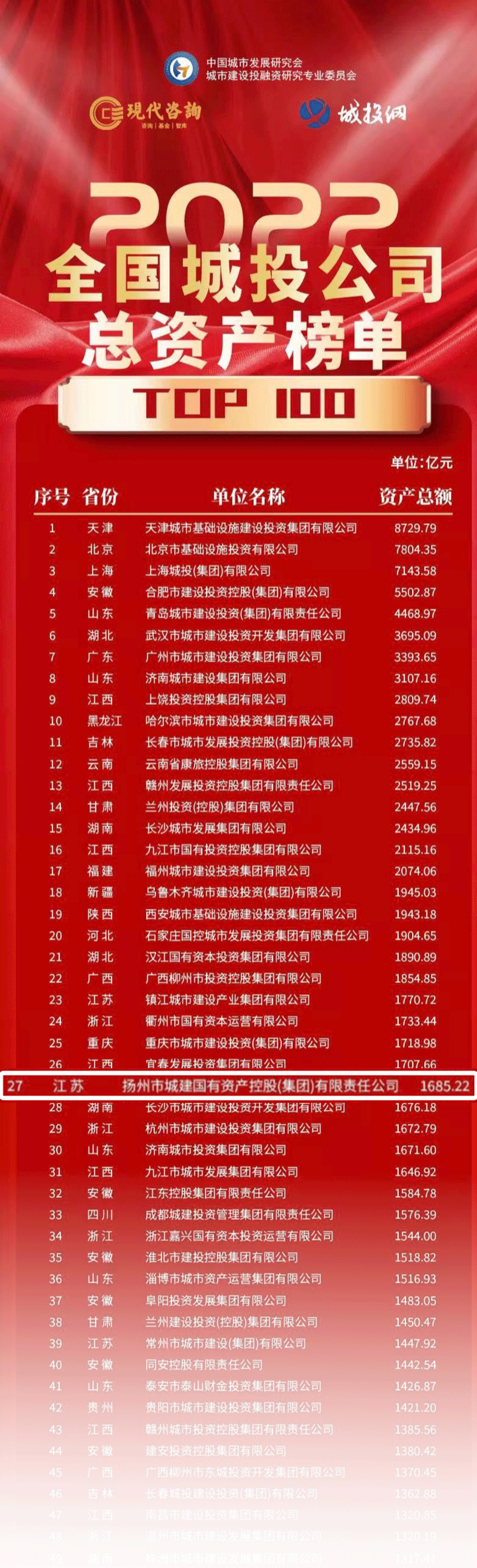 9月6日,由中國(guó)城市發(fā)展研究會(huì)城市建設(shè)投融資研究專業(yè)委員會(huì)、江蘇現(xiàn)代資產(chǎn)投資管理顧問(wèn)有限公司、城市投資網(wǎng)等三家單位聯(lián)合發(fā)布的“2022全國(guó)城投公司總資產(chǎn)情況排行榜”,城控集團(tuán)以總資產(chǎn)1685.22億元位列27名,較2021年排名實(shí)現(xiàn)再提升。