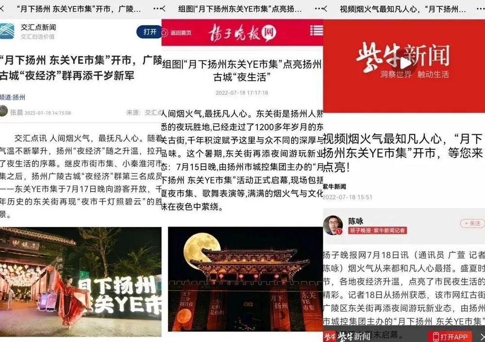 熱鬧集市異彩紛呈,吸引游客紛至沓來,點(diǎn)亮揚(yáng)州古城夜經(jīng)濟(jì),這也引發(fā)了多家媒體的關(guān)注與報(bào)道,包括多家國(guó)家級(jí)媒體、省市級(jí)媒體以及揚(yáng)州本地自媒體。