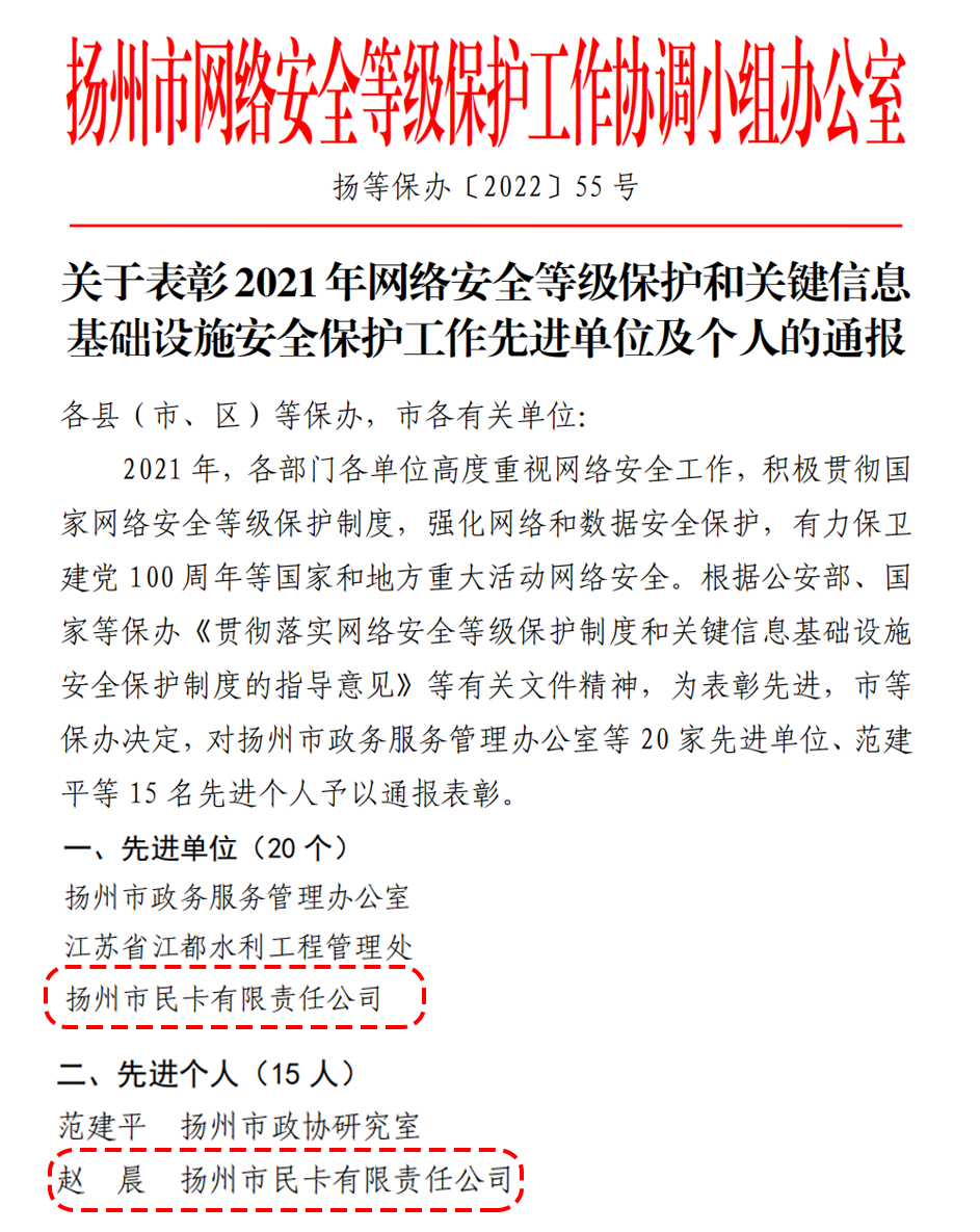 近日,揚州市民卡公司被揚州市網(wǎng)絡(luò)安全等級保護工作協(xié)調(diào)小組辦公室評為“2021年網(wǎng)絡(luò)安全等級保護和關(guān)鍵信息基礎(chǔ)設(shè)施安全保護工作先進單位”,趙晨同志被表彰為“先進個人”。