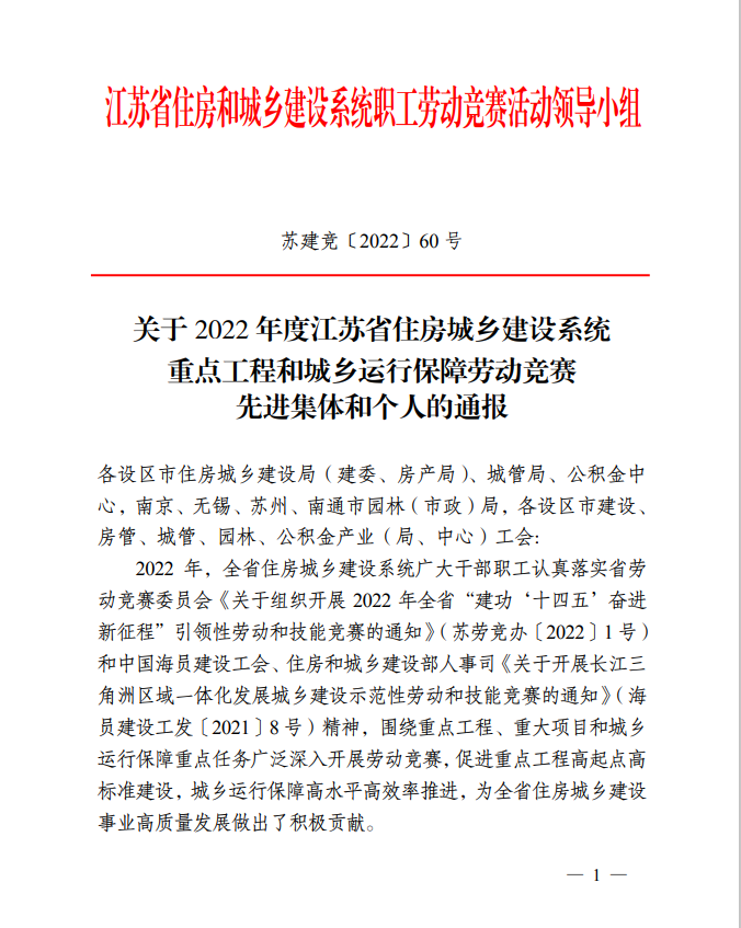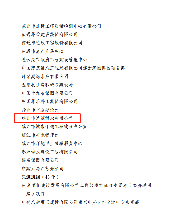 12月30日,從江蘇省住房和城鄉(xiāng)建設(shè)系統(tǒng)職工勞動競賽活動領(lǐng)導(dǎo)小組傳來喜訊,揚州市潔源排水有限公司被表彰為“2022年度江蘇省住房城鄉(xiāng)建設(shè)系統(tǒng)重點工程和城鄉(xiāng)運行保障勞動競賽先進集體”。