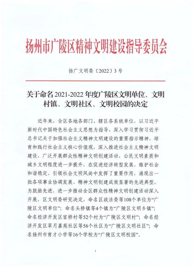 上善公司在集團(tuán)和廣陵區(qū)文明辦的正確指導(dǎo)下,積極探索文明建設(shè)的新思路、新方法,實現(xiàn)物質(zhì)文明和精神文明的同步提升。近期,廣陵區(qū)文明建設(shè)指導(dǎo)委員會發(fā)文表彰了2021-2022年度廣陵區(qū)文明單位,上善公司在此次評選中脫穎而出,被授予該項榮譽稱號。
