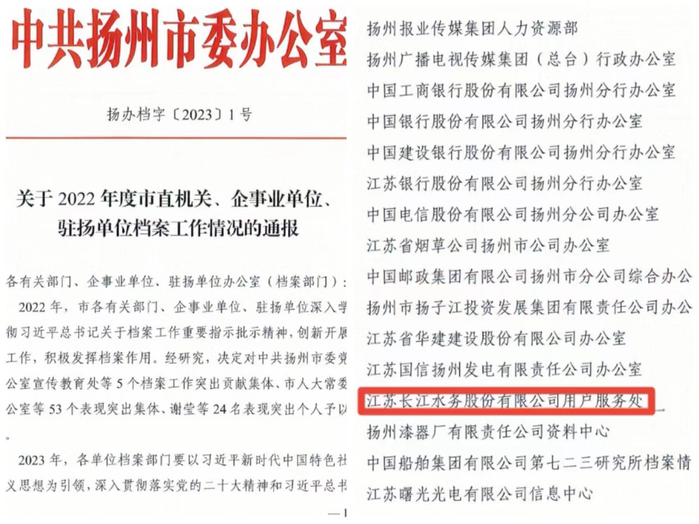 近日,長江水務(wù)公司用戶服務(wù)處獲得中共揚(yáng)州市委辦公室頒發(fā)的“2022年度檔案工作表現(xiàn)突出集體”榮譽(yù)稱號(hào)。