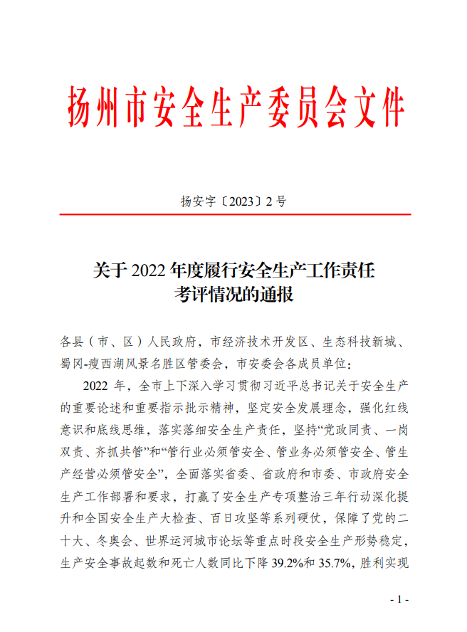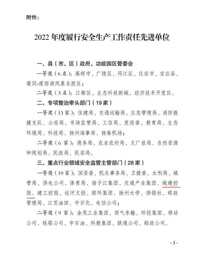 2022年,城控集團(tuán)深入貫徹落實習(xí)近平總書記關(guān)于安全生產(chǎn)重要思想論述,堅守“生命至上、安全發(fā)展”理念,全面落實安全生產(chǎn)責(zé)任,強(qiáng)化工作舉措,順利完成市安委會下達(dá)的目標(biāo)任務(wù),被表彰為2022年度履行安全生產(chǎn)工作責(zé)任先進(jìn)單位一等獎。