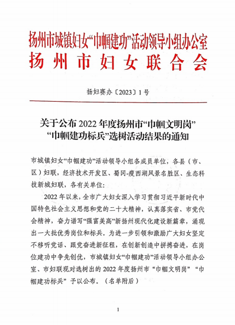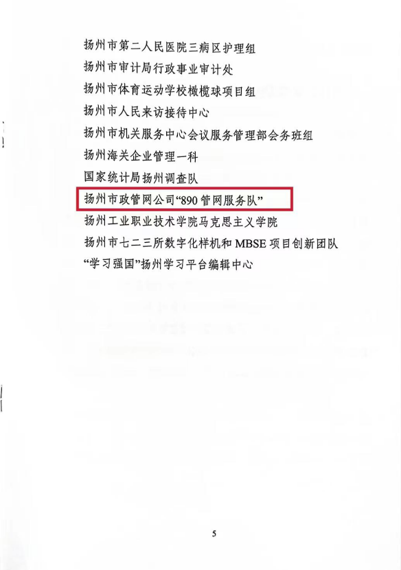 近日,市婦聯(lián)、市婦女“巾幗建功”活動領(lǐng)導(dǎo)小組聯(lián)合表彰了一批揚州市“巾幗文明崗”和“巾幗建功標兵”。揚州市政管網(wǎng)有限公司“890管網(wǎng)服務(wù)隊”榮獲“巾幗文明崗”稱號。