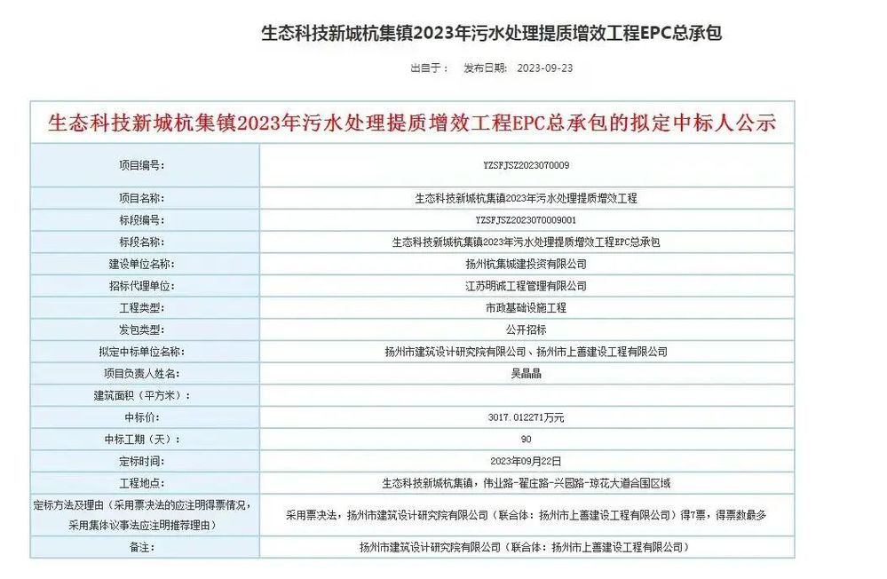 近期,上善公司再次成功中標(biāo)生態(tài)科技新城杭集鎮(zhèn)污水處理提質(zhì)增效工程,中標(biāo)金額3017萬(wàn)元。