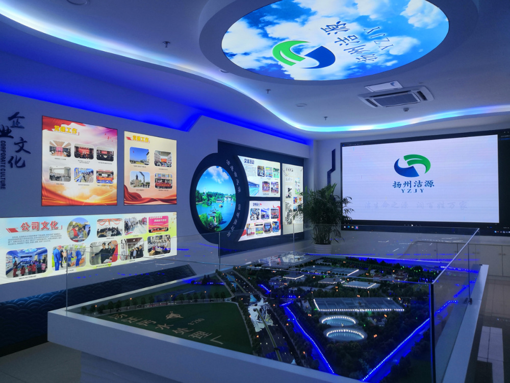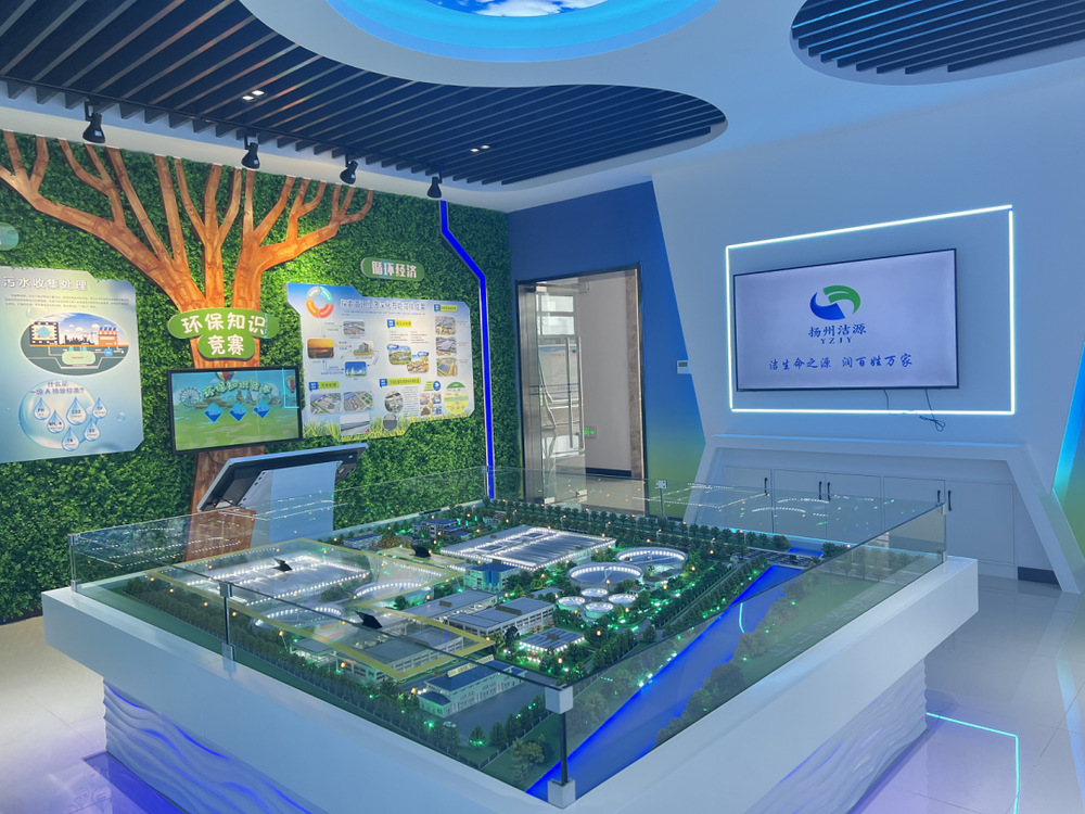 揚州潔源節(jié)水科教館硬件設(shè)施由揚州潔源環(huán)境公司傾力打造,共設(shè)有1個總館和3個分館。室內(nèi)展廳內(nèi)設(shè)有2套廠區(qū)布局沙盤、3套宣傳大屏、2套宣傳滾動屏、1套人機互動觸摸屏、1套交互式答題機等多媒體設(shè)施。室外設(shè)施主要涵蓋污水預(yù)處理、生物處理和提標段處理、中水回用等污水處理設(shè)施。