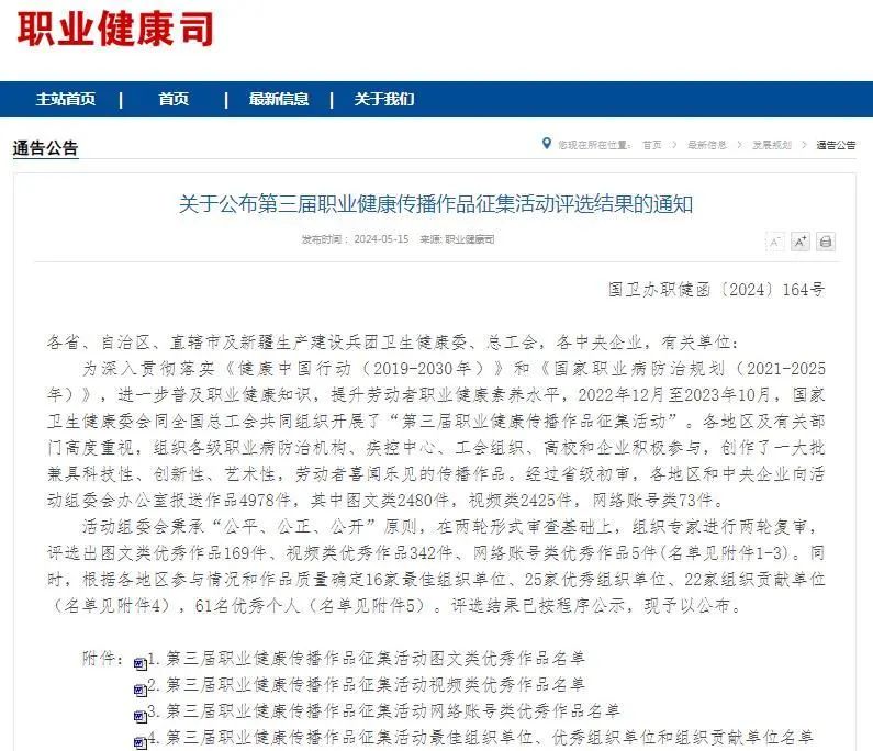 為深入貫徹落實(shí)《健康中國(guó)行動(dòng)(2019-2030年)》和《國(guó)家職業(yè)病防治規(guī)劃(2021-2025年)》,進(jìn)一步普及職業(yè)健康知識(shí),提升勞動(dòng)者職業(yè)健康素養(yǎng)水平,國(guó)家衛(wèi)生健康委、全國(guó)總工會(huì)共同組織開(kāi)展了“第三屆職業(yè)健康傳播作品征集活動(dòng)”。我公司積極創(chuàng)作,踴躍參與征集活動(dòng),選送的《共享職業(yè)健康 共創(chuàng)健康水務(wù)》經(jīng)過(guò)初審、形式審查和專家評(píng)審等程序,入圍獲獎(jiǎng)名單。