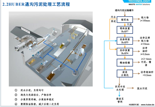 處理設備采用固體分類和固液分離技術,通過洗滌轉(zhuǎn)鼓裝置與洗砂裝置的協(xié)同作業(yè),將通溝污泥中的粗大物質(zhì)、細砂及砂粒有效分離。其中,粗大物質(zhì)被輸送至垃圾處理設施,細砂得以回收再利用;濾出的污水則經(jīng)過精細過濾裝置和旋流分離一體化裝置的進一步處理后,排放至污水處理廠。整套流程實現(xiàn)了通溝污泥的減量化、穩(wěn)定化、無害化和資源化。